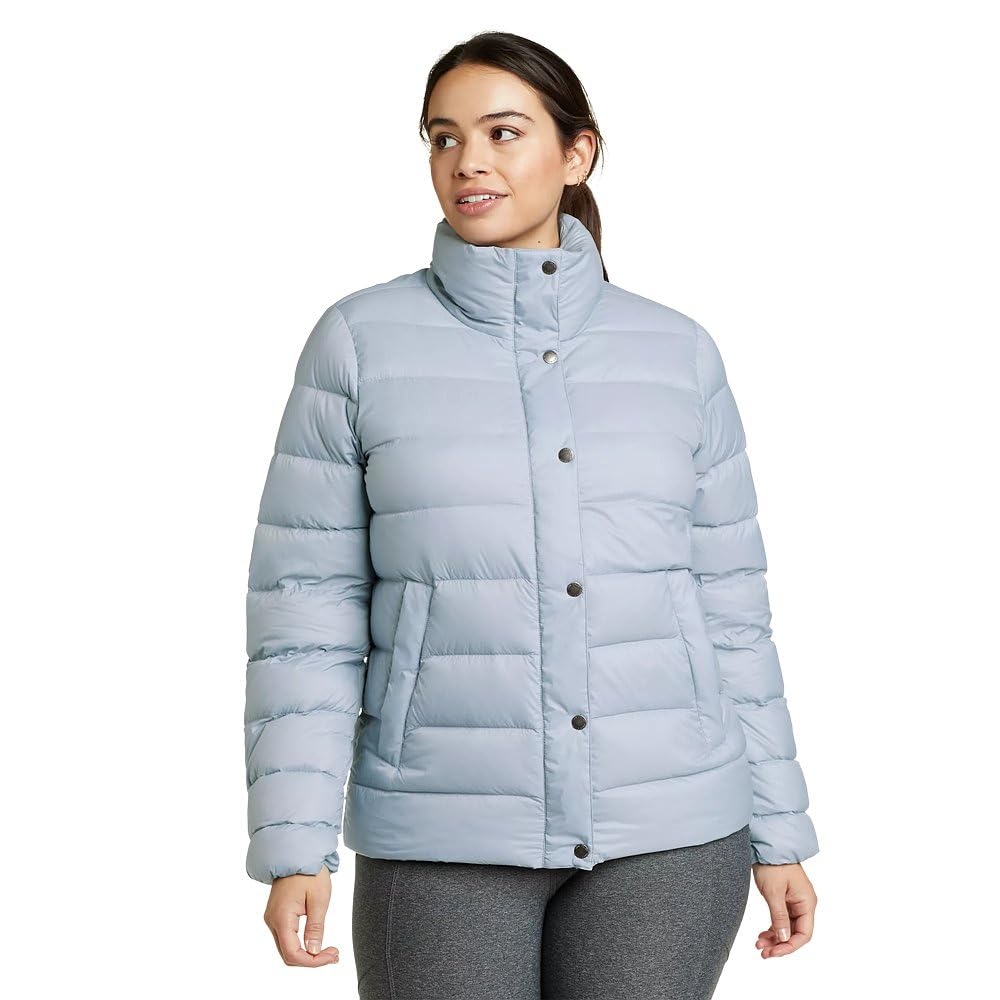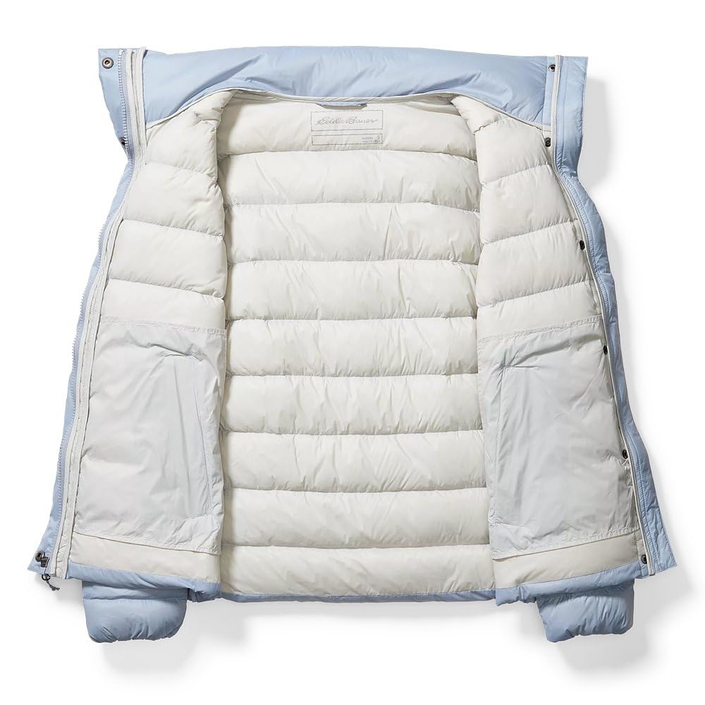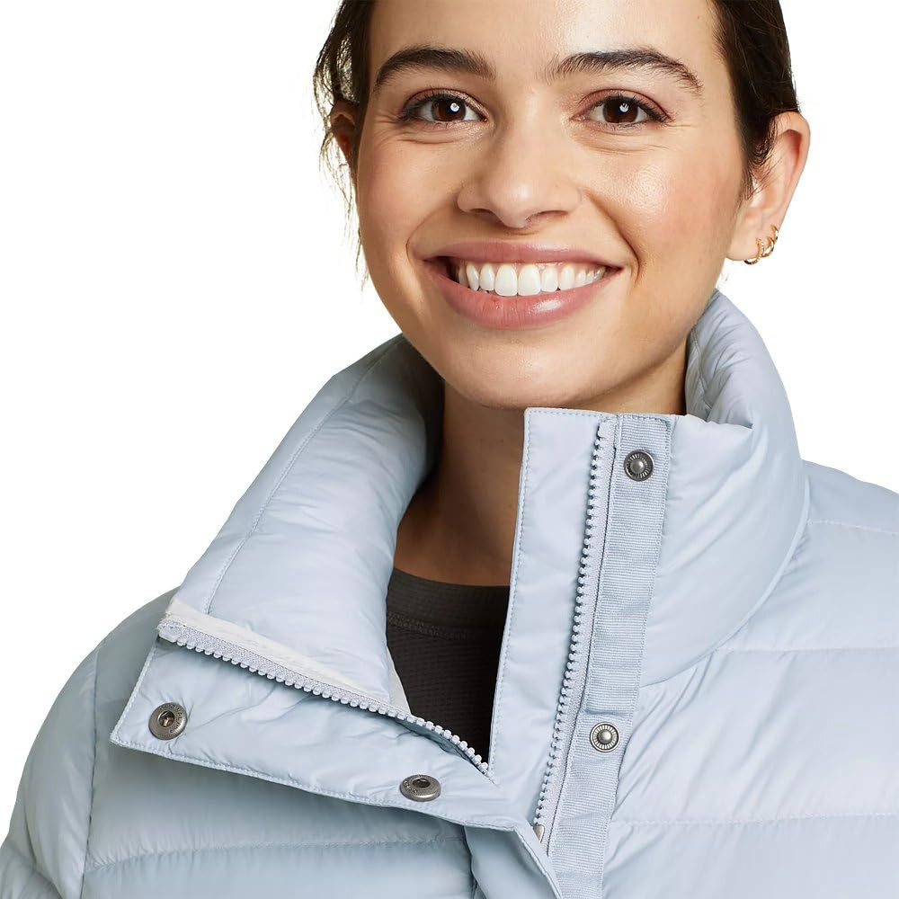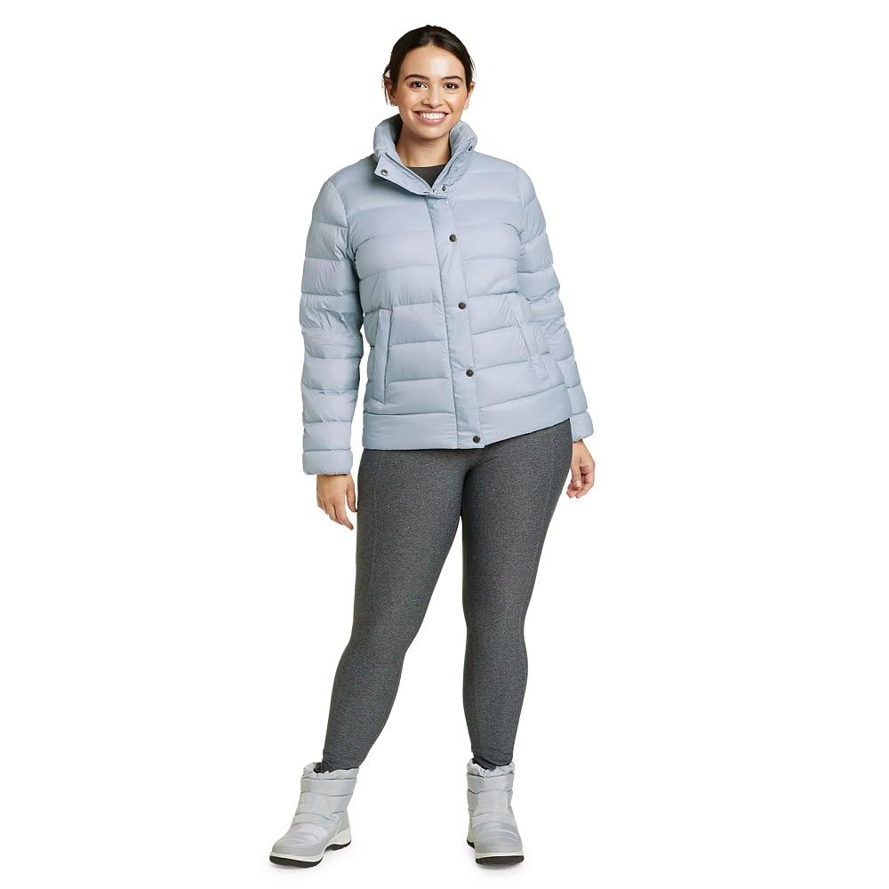 Light blue puffer jacket designed to provide comfortable warmth with lightweight insulation. Features quilted padding that retains heat while allowing breathability.