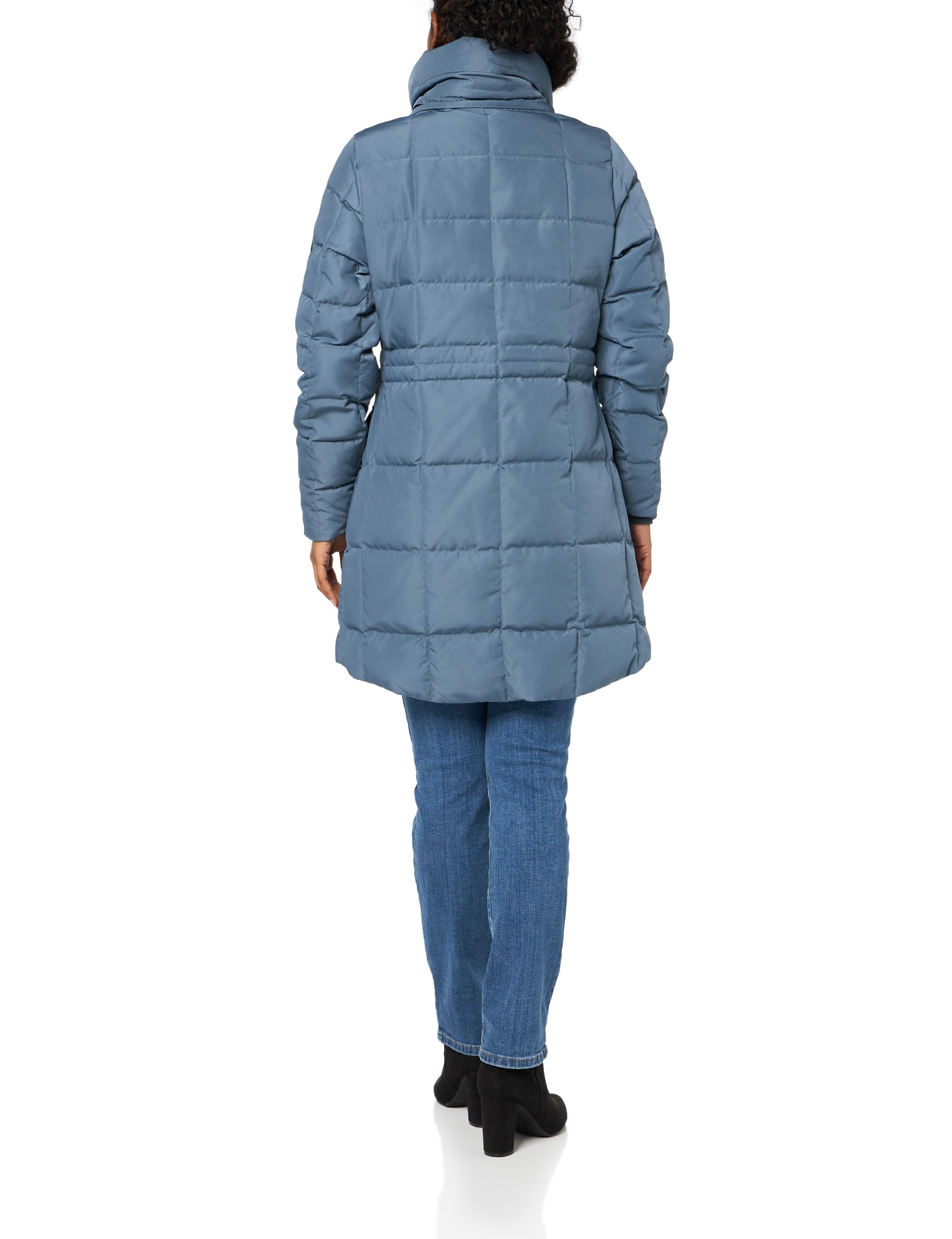 Blue quilted trench coat designed for warmth and weather resistance. Features insulated padding for comfortable heat retention and a relaxed fit for layering.