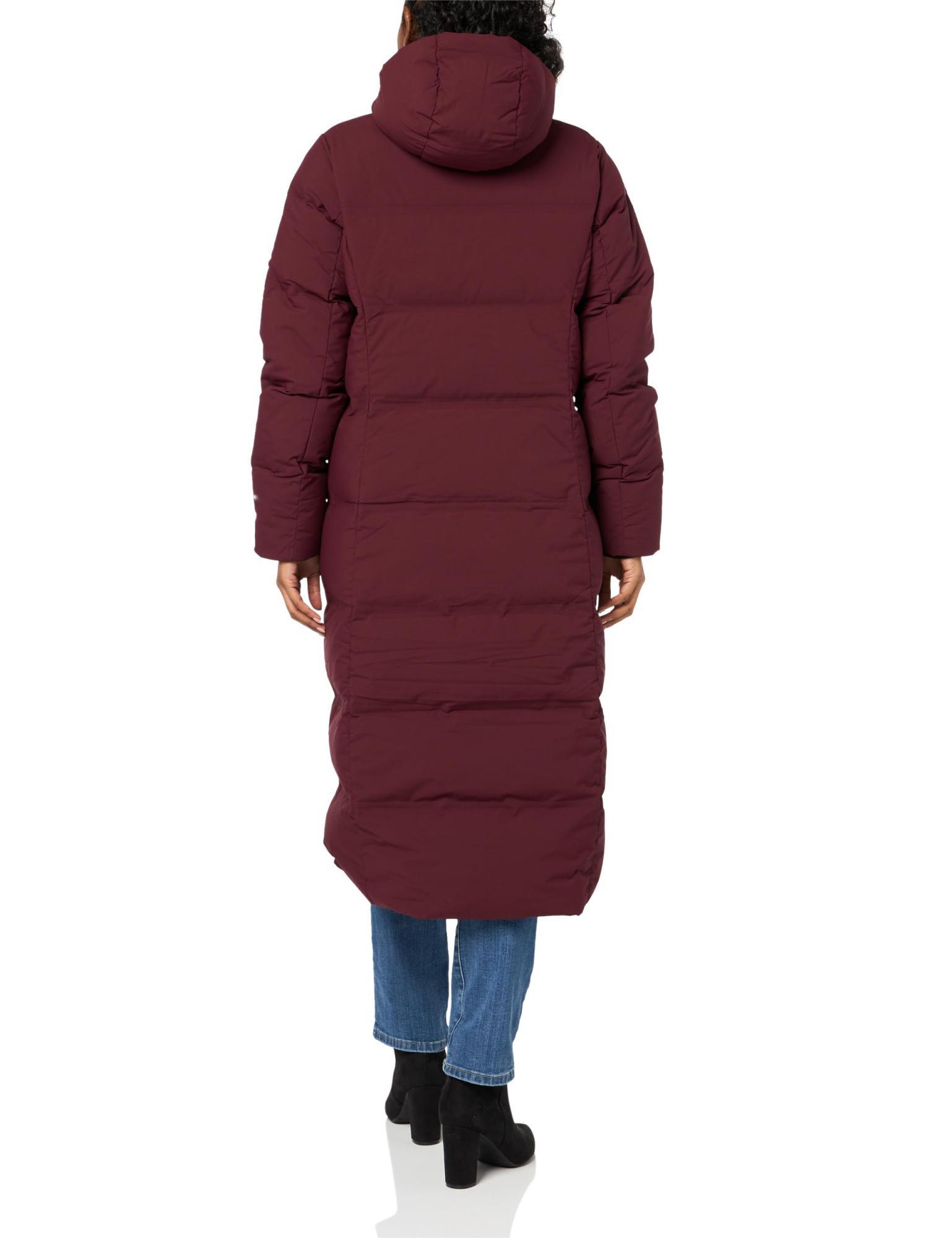 Long burgundy puffer coat designed to provide exceptional warmth and coverage in cold weather. Features insulated padding for effective heat retention and a streamlined silhouette.